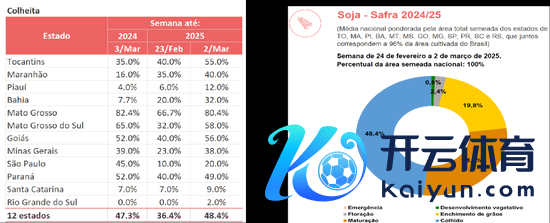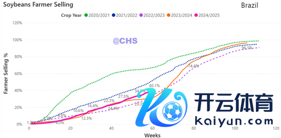 为止3.2,得益程度48.4%(环比增12%,同比高1.1%),刻下各阶段占比分别为幼苗期(0.8%)、着花期(2.4%)、灌浆饱读粒期(19.8%)、锻真金不怕火期(28.7%)。据IMEA2.28数据,MT大豆收割率达到82.30%,较前一周擢升16.14%,高于历史同时均值77.44%,略落伍于2024年同时的84.66%。