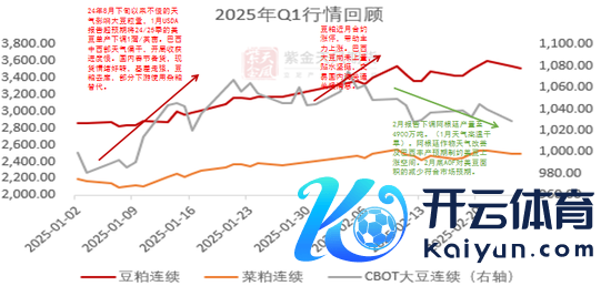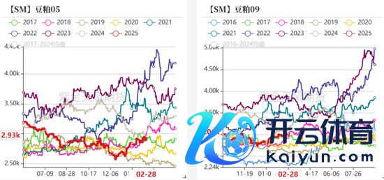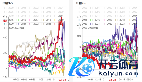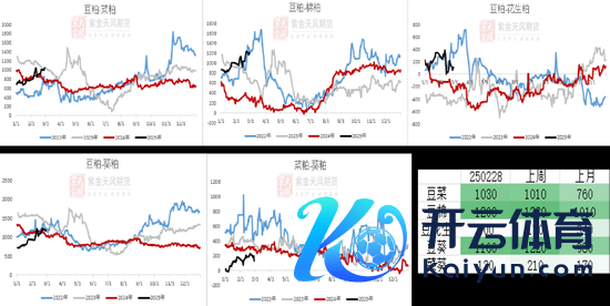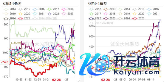 2月上旬,现货基差大幅走强。2.1特朗普挥起关税大棒,自然我国并未对进口好意思豆加税,但市集作念多花式依旧攀升;年后第二周,油厂大豆压榨量仅几十万吨,加之2月初巴西得益程度偏慢、口岸装船慢,近月贴水坚挺,形成节律上的供应紧缺。