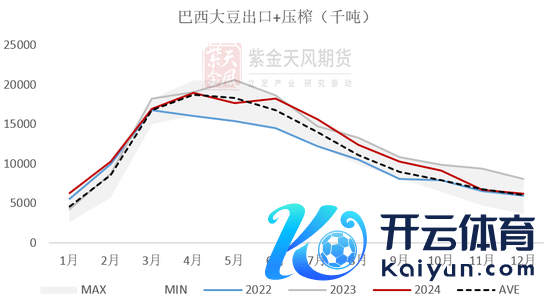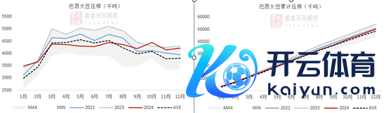 24年,巴西累计压榨大豆5024万吨(低于旧年同时的5416.5万吨),内容压榨量与全年预估的5540万吨有一些出入。24年累计压榨+出口1.49亿吨,同比减幅4.5%。