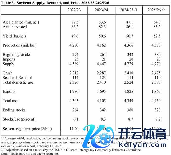 农业瞻望论坛(AOF)由好意思国农业部(USDA)组织,亦然好意思国农业部历史最悠久、界限最大的年度论坛。论坛会策划时下流行及新兴的农业话题,如人人贸易、农业立异、动物和作物生物技能的发展以及巨额商品市集等,本年于2.27-28(周四-周五)召开,公布25/26年度的好意思豆供需阵势瞻望。【大豆】揣测2025年好意思国大豆训诫面积为8400万英亩。(路透预期值为8440万英亩,彭博预期值为8440万英亩,2024年最终训诫面积为8710万英亩,2024年瞻望论坛为8750万英亩)【玉米】揣测2025年好意思国玉米训诫面积为9400万英亩。(路透预期值为9360万英亩,彭博预期值为9350万英亩,2024年最终训诫面积为9060万英亩,2024年瞻望论坛为9100万英亩)【小麦】揣测2025年好意思国小麦训诫面积为4700万英亩。(路透预期值为4670万英亩,彭博预期值为4670万英亩,2024年最终训诫面积为4610万英亩,2024年瞻望论坛为4700万英亩)。